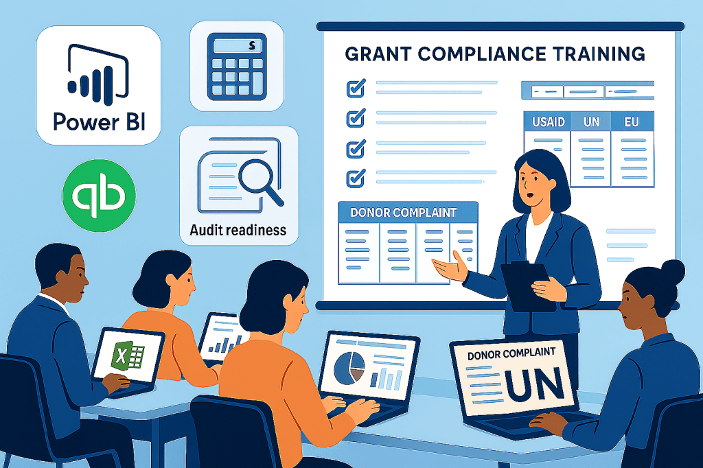 Strengthen your financial skills and donor compliance confidence with our practical finance training programs. Whether you’re a non-finance professional managing project budgets or a finance officer preparing for audits, we offer step-by-step guidance on budgeting, grant tracking, reporting, and internal controls. Courses include Finance DPro certification prep, digital finance tools (Excel, Power BI, QuickBooks), and donor-aligned budgeting formats (USAID, UN, EU). You’ll learn how to interpret budgets, generate financial reports, and pass donor reviews with clarity and professionalism. These programs are ideal for NGO and business professionals seeking practical tools to enhance financial accountability and drive funding success.